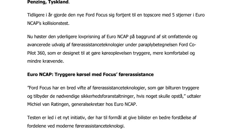 ”Ford Focus har en bred vifte af førerassistanceteknologier, som gør bilturen tryggere og tilbyder de nødvendige sikkerhedsforanstaltninger, hvis noget skulle opstå,” udtaler Michiel van Ratingen, generalsekretær hos Euro NCAP.