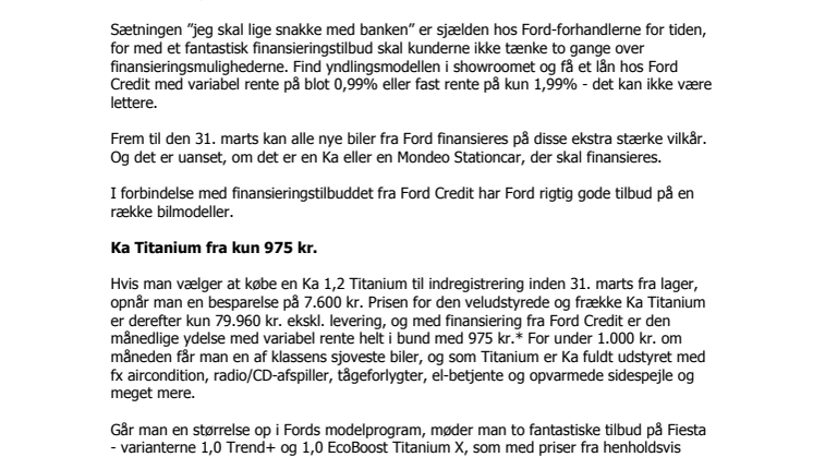 Sætningen ”jeg skal lige snakke med banken” er sjælden hos Ford-forhandlerne for tiden, for med et fantastisk finansieringstilbud skal kunderne ikke tænke to gange over finansieringsmulighederne. Find yndlingsmodellen i showroomet og få et lån hos Ford Credit med variabel rente på blot 0,99% eller fast rente på kun 1,99% - det kan ikke være lettere.