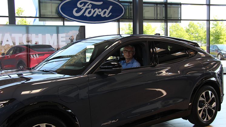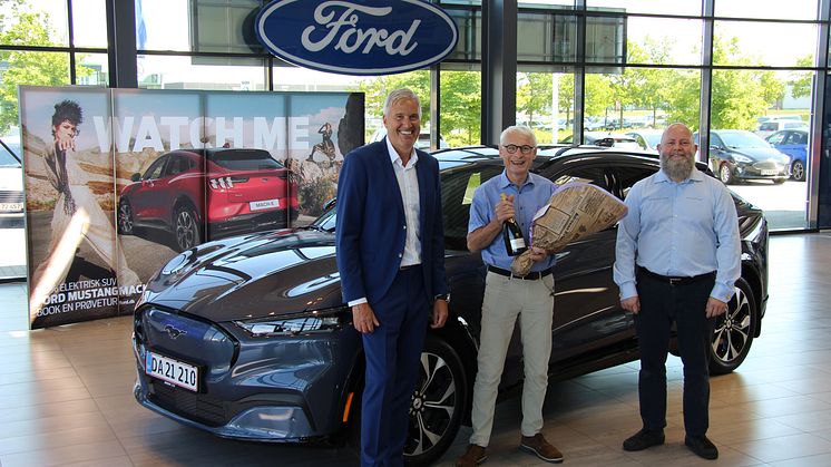 Uwe Holmsgaard fra Hillerød har netop fået nøglerne til sin Ford Mustang Mach-E, og han er dermed den første danske kunde, der kan sætte sig bag rattet i sin nye elektriske SUV. I de kommende måneder vil flere hundrede biler fylde gadebilledet, når Fords første fuldelektriske bil i en lind strøm udleveres til kunderne.