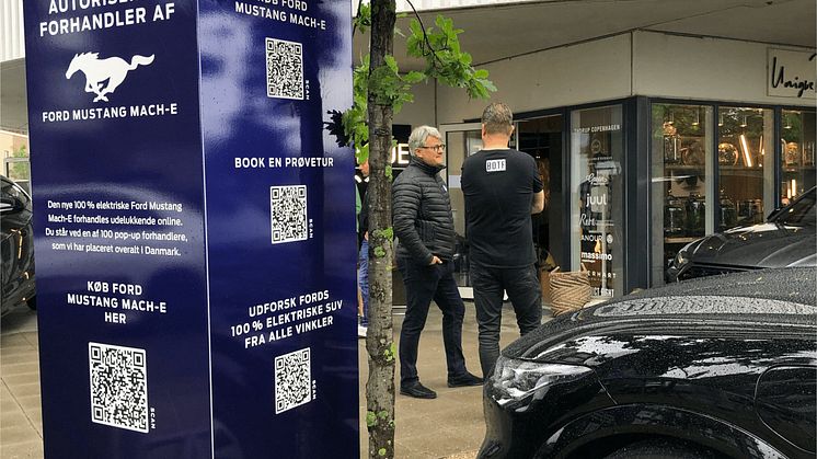 Den fuldt elektriske Ford Mustang Mach-E kan udelukkende bestilles online, og derfor sørger Ford nu for at bringe elbilen ud til køberne. De 2 meter høje ’forhandlere’ stikker ud i landskabet, og er dermed svære at overse. Forbipasserende inviteres ind i et Mustang Mach-E univers via tre QR-koder, der gør det muligt at bestille en Mustang Mach-E online, bestille en prøvetur samt at indhente mere information om den nye elbil. På udvalgte lokationer er det endvidere muligt at prøvekøre den nye Mustang Mach-E på stedet. Hold øje med Fords sociale kanaler for mere information om de særlige forhandlere og lokationer, der løbende bliver offentliggjort.