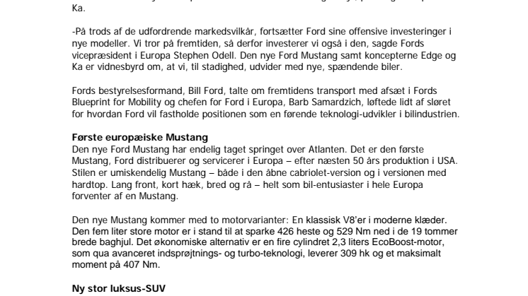 -På trods af de udfordrende markedsvilkår, fortsætter Ford sine offensive investeringer i nye modeller. Vi tror på fremtiden, så derfor investerer vi også i den, sagde Fords vicepræsident i Europa Stephen Odell. Den nye Ford Mustang samt koncepterne Edge og Ka er vidnesbyrd om, at vi, til stadighed, udvider med nye, spændende biler.