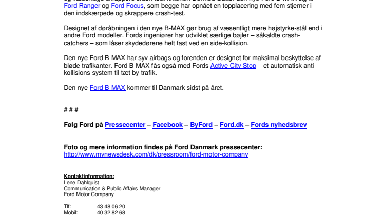Nu er tvivlen udryddet. Europas førende crash-test-institution, Euro NCAP, har netop tildelt den nye Ford B-MAX fem ud af fem mulige stjerner efter helt nye og væsentlige skrappere crash-test-kriterier. Dermed slutter den nye Ford B-MAX sig til Ford Ranger og Ford Focus, som begge har opnået en topplacering med fem stjerner i den indskærpede og skrappere crash-test.