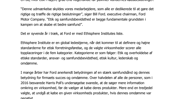 Ford Motor Company er som den eneste bilproducent repræsenteret på Ethisphere Institutes liste over verdens mest etiske virksomheder i 2016. Og det er vel at mærke i en tid, hvor etik i højere grad end nogensinde før påvirker kundernes købsbeslutninger.