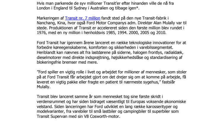 Hen over sommeren, mere præcist den 20. juni oprandt dagen hvor Ford kunne fejre produktionen af Ford Transit nummer syv million siden lanceringen i 1965. Markeringen af Transit nr. 7 million fandt sted på den nye Transit-fabrik i Nanchang, Kina, hvor også Ford Motor Companys adm. Direktør Alan Mulally var til stede. Produktionen af Transit er accelereret siden den første million blev rundet i 1976, med en ny million i henholdsvis 1985, 1994. 2000, 2005 og 2010.
