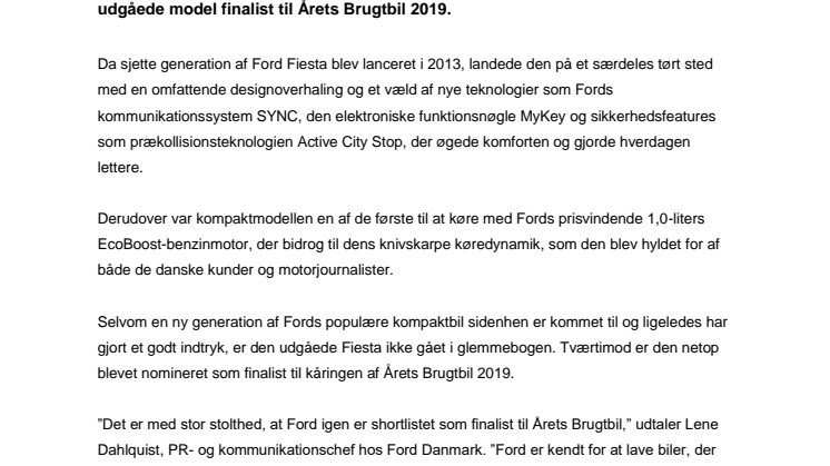 Selvom en ny generation af Fords populære kompaktbil sidenhen er kommet til og ligeledes har gjort et godt indtryk, er den udgåede Fiesta ikke gået i glemmebogen. Tværtimod er den netop blevet nomineret som finalist til kåringen af Årets Brugtbil 2019.