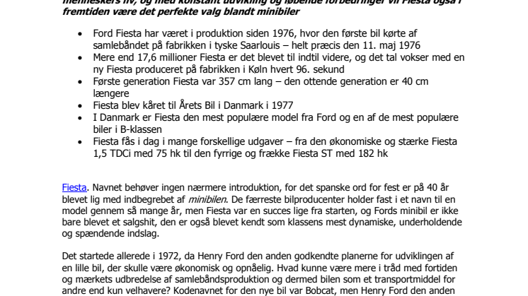 Fiesta. Navnet behøver ingen nærmere introduktion, for det spanske ord for fest er på 40 år blevet lig med indbegrebet af minibilen. De færreste bilproducenter holder fast i et navn til en model gennem så mange år, men Fiesta var en succes lige fra starten, og Fords minibil er ikke bare blevet et salgshit, den er også blevet kendt som klassens mest dynamiske, underholdende og spændende indslag.