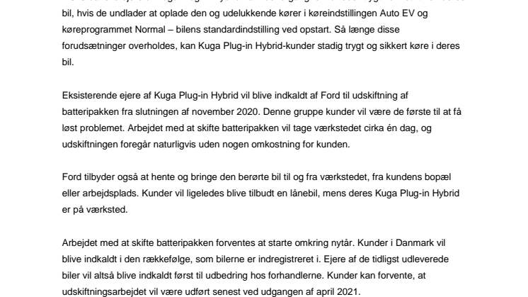 Alle ejere af Kuga Plug-in Hybrid vil blive indkaldt til udskiftning af batteripakken. Ford forventer at påbegynde udskiftningen på de første biler i slutningen af december 2020, og at batteripakken i alle Kuga Plug-in Hybrider vil være skiftet ved udgangen af april 2021.
