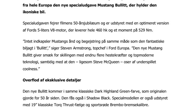 ”Intet indkapsler Mustangs ånd og begejstring på samme måde som den fantastiske biljagt i ’Bullitt’,” siger Steven Armstrong, topchef i Ford Europa. ”Den nye Mustang Bullitt giver smæk for skillingen med endnu flere hestekræfter og topmoderne teknologi, samtidig med at den – ligesom Steve McQueen – oser af underspillet coolness.”