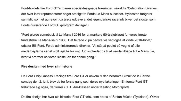 ”Ford gjorde comeback til Le Mans i 2016 for at markere 50-årsjubilæet for vores første fantastiske Le Mans-sejr i 1966. Det fejrede vi på bedste vis ved også at vinde 2016-løbet,” udtaler Bill Ford, Fords administrerende direktør. ”At stå på podiet på vegne af alle medarbejderne var et stolt øjeblik for mig. Og vi glæder os til at vende tilbage til Le Mans i år, hvor vi nærmer os vores sidste løb for denne gang.”