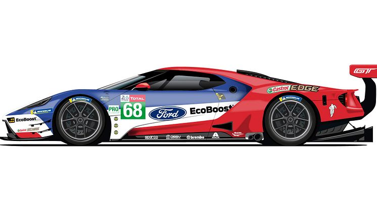 Ford GT #68 er Fords seneste Le Mans-sejrherre, som kom først over det ternede flags målstreg i 2016. Den køres af Dirk Müller (Tyskland), Joey Hand (USA) og Sébastien Bourdais (Frankrig) i de samme farver som sejren for tre år siden.