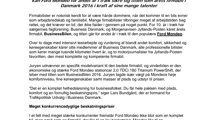 Morgenavisen Jyllands-Posten og Business Danmark har de sidste 10 år kåret firmabilisternes favorit, BusinessBilen, og trods nye konkurrenter kan Ford Mondeo for andet år i træk sikre sig titlen som årets firmabil i Danmark 2016 i kraft af sine mange talenter