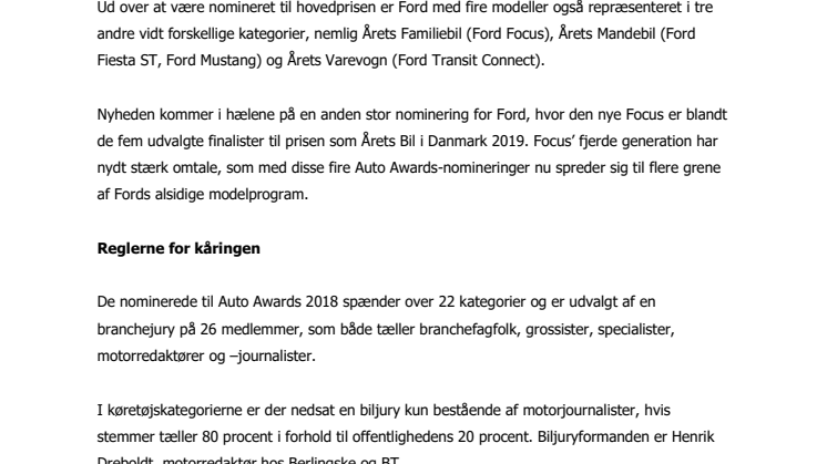 Nyheden kommer i hælene på en anden stor nominering for Ford, hvor den nye Focus er blandt de fem udvalgte finalister til prisen som Årets Bil i Danmark 2019. Focus’ fjerde generation har nydt stærk omtale, som med disse fire Auto Awards-nomineringer nu spreder sig til flere grene af Fords alsidige modelprogram.
