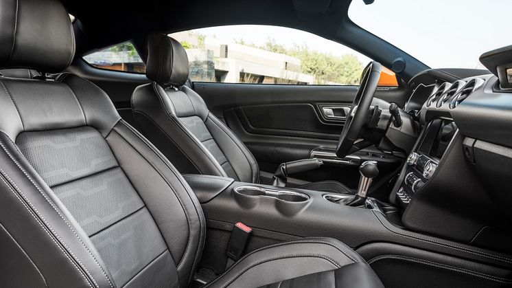 En Carbon Sport-interiørpakke er en mulighed på tværs af Mustang-modelprogrammet, og den attraktive pakke inkluderer Alcantara-indlæg i døre, gearstang og sæder og kulfiberpaneler på instrumentpanelet. Læderbeklædte sæder med varme og køling og ratvarme fås for første gang i Mustang. Kunder som vælger Recaro-racersæderne i læder kan nu vælge mellem tre farver: Show Stopper Red, Midnight Blue og Ebony.