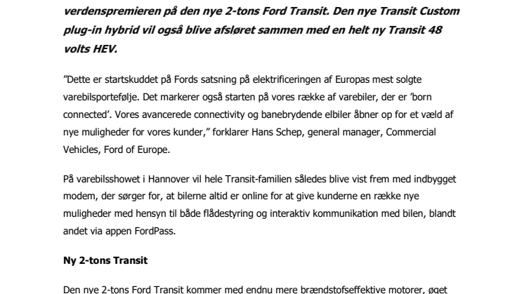 ”Dette er startskuddet på Fords satsning på elektrificeringen af Europas mest solgte varebilsportefølje. Det markerer også starten på vores række af varebiler, der er ’born connected’. Vores avancerede connectivity og banebrydende elbiler åbner op for et væld af nye muligheder for vores kunder,” forklarer Hans Schep, general manager, Commercial Vehicles, Ford of Europe.