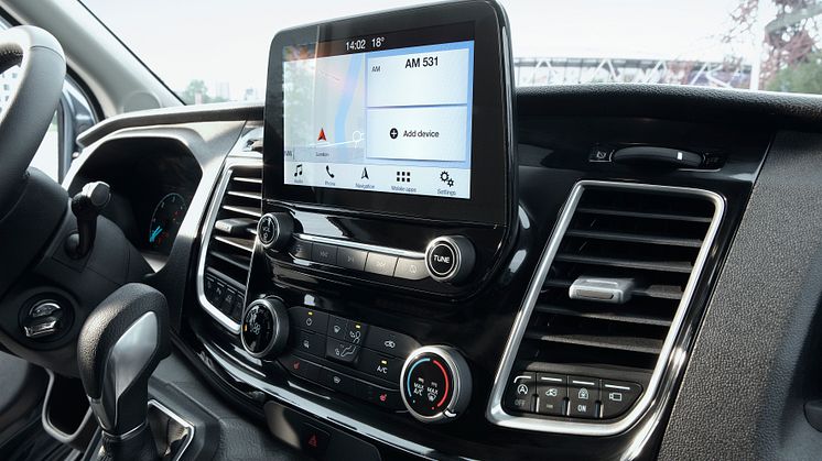 Derudover kommer den nye Ford Transit også med Fords moderne infotainment-system SYNC 3, hvor man kan styre langt de fleste funktioner med dansk talestyring eller via en 8-tommers touchskærm.