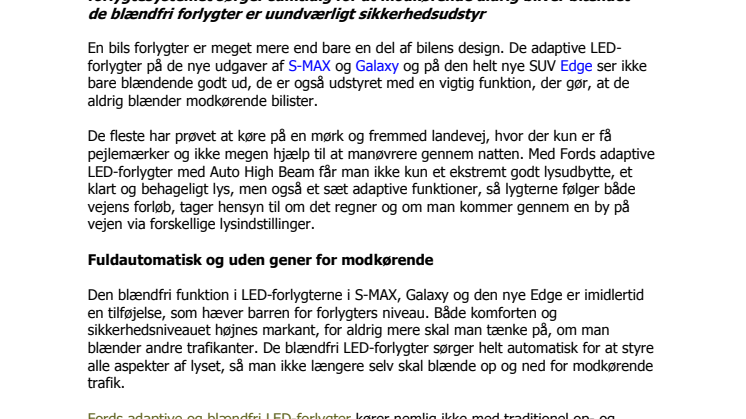 En bils forlygter er meget mere end bare en del af bilens design. De adaptive LED-forlygter på de nye udgaver af S-MAX og Galaxy og på den helt nye SUV Edge ser ikke bare blændende godt ud, de er også udstyret med en vigtig funktion, der gør, at de aldrig blænder modkørende bilister.