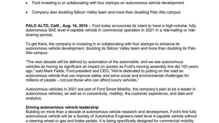 PALO ALTO, Calif., Aug. 16, 2016 – Ford today announces its intent to have a high-volume, fully autonomous SAE level 4-capable vehicle in commercial operation in 2021 in a ride-hailing or ride- sharing service.