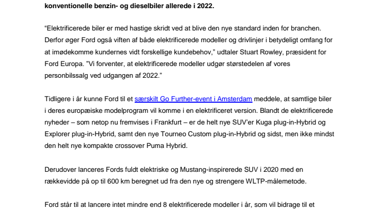 “Elektrificerede biler er med hastige skridt ved at blive den nye standard inden for branchen. Derfor øger Ford også viften af både elektrificerede modeller og drivlinjer i betydeligt omfang for at imødekomme kundernes vidt forskellige kundebehov,” udtaler Stuart Rowley, præsident for Ford Europa. ”Vi forventer, at elektrificerede modeller udgør størstedelen af vores personbilssalg ved udgangen af 2022.”