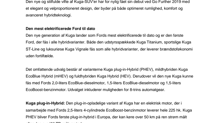 Den nye generation af Kuga lander som Fords mest elektrificerede til dato og er den første Ford, der fås i alle hybridvarianter. Både den udstyrsspækkede Kuga Titanium, sportslige Kuga ST-Line og luksuriøse Kuga Vignale fås som alle hybridvarianter, der leverer brændstoføkonomi uden fortilfælde.