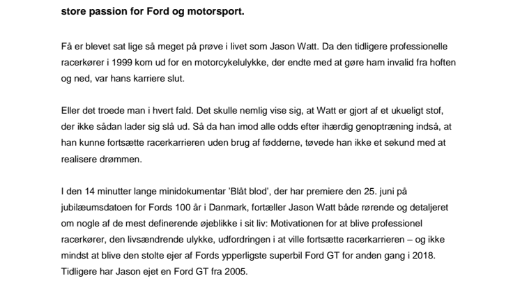 I den 14 minutter lange minidokumentar ’Blåt blod’, der har premiere den 25. juni på jubilæumsdatoen for Fords 100 år i Danmark, fortæller Jason Watt både rørende og detaljeret om nogle af de mest definerende øjeblikke i sit liv: Motivationen for at blive professionel racerkører, den livsændrende ulykke, udfordringen i at ville fortsætte racerkarrieren – og ikke mindst at blive den stolte ejer af Fords ypperligste superbil Ford GT for anden gang i 2018. Tidligere har Jason ejet en Ford GT fra 2005.