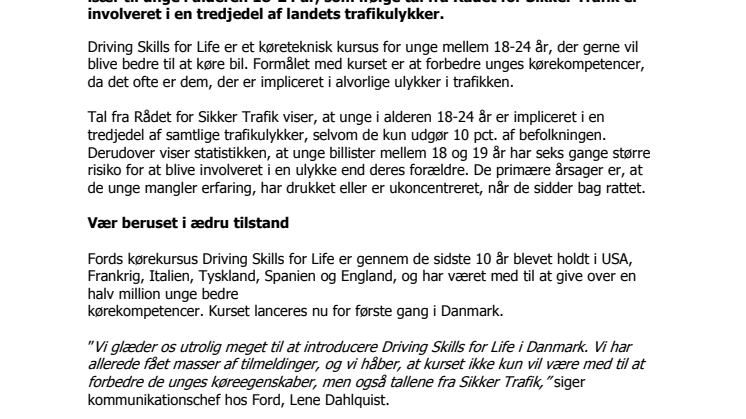 ”Vi glæder os utrolig meget til at introducere Driving Skills for Life i Danmark. Vi har allerede fået masser af tilmeldinger, og vi håber, at kurset ikke kun vil være med til at forbedre de unges køreegenskaber, men også tallene fra Sikker Trafik,”siger kommunikationschef hos Ford, Lene Dahlquist.