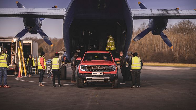 I filmen, Next-Gen Ford Ranger Raptor Reveal, ser man den nye Ranger Raptor fastspændt i et fragtfly i luften over Europa, da motoren på den hårdføre pickup pludselig tænder og bilen bryder ud af flyet – i et imponerende hop ned på landingsbanen*.