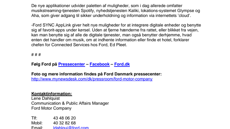 -Ford SYNC AppLink giver helt nye muligheder for at integrere digitale enheder og benytte sig af favorit-apps under kørsel. Uden at fjerne hænderne fra rattet, eller blikket fra vejen, kan man benytte sig af alle de digitale tjenester, man også benytter derhjemme, hvad enten det handler om musik, om at indhente information eller finde et hotel, forklarer chefen for Connected Services hos Ford, Ed Pleet.