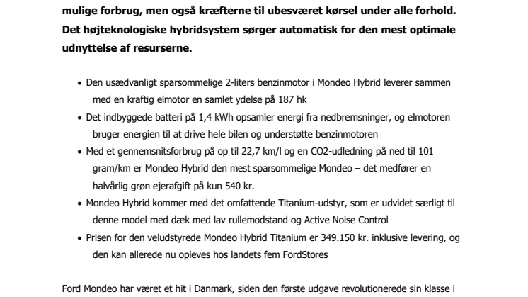 Ford Danmark følger konstant udviklingen på markedet, og for at sikre og udvide mellemklassebilens position introduceres nu en version af Mondeo på det danske marked, som giver kunderne en helt ny oplevelse – både når det kommer til måden at køre på og oplevelsen af selve bilen: Mondeo Hybrid (HEV, Hybrid Electric Vehicle). Mondeo Hybrid indtager en unik position som den eneste hybrid i klassen, der ikke skal lades op via et eksternt kabel for at yde sit mest optimale i alle situationer. I modsætning til konkurrerende mærkers modeller, som er plug-in-hybrider, har Mondeo Hybrid en markant lavere vægt. Det gør, at den bevarer sine anerkendte dynamiske køreegenskaber og ikke slæber rundt på unødig vægt, som forværrer brændstoføkonomien, når der ikke længere er strøm på batteriet.