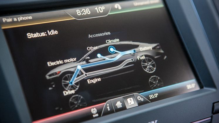 I de to TFT-farvedisplays, som står skarpt i instrumenthuset, kan man ikke kun følge samspillet mellem benzinmotoren og elmotoren og om Mondeo Hybrid kører på ren el, men også blive oplyst om, hvor god man er til at skabe den rette bremseeffekt, så man samler mest mulig energi. I Fords infotainment- og nødopkaldssystem SYNC 3 med 8” touchscreen, der i Mondeo Hybrid som standard kommer med indbygget navigation, kan man under kørsel nemt og overskueligt se, hvilke resurser bilen bruger på et givent tidspunkt.