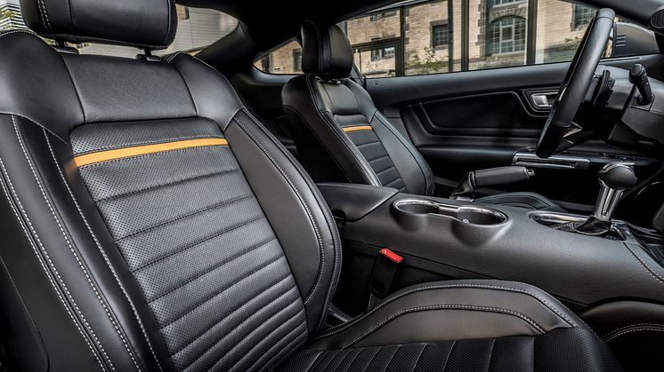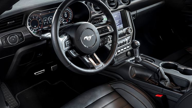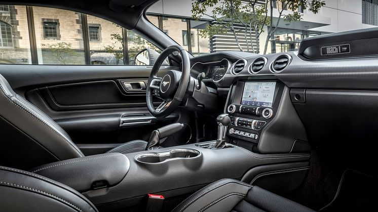 Kabinen er Ebony-sort med detaljer i Dark Engine-aluminium. De sportslige lædersæder har Metal Grey-syninger, og hver Mustang Mach 1 har et nummereret emblem i instrumentbrættet. Derudover har det 12” digitale instrumentpanel også et nyt opstartsdisplay.