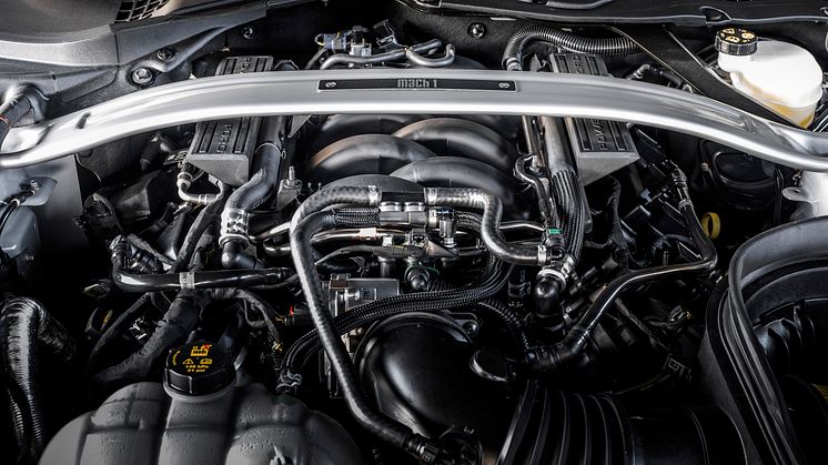 Under kølerhjelmen på den nye Mustang Mach 1 finder man Fords 5,0-liters V8’er-benzinmotor med 460 hk. Motoren er lavet i ren aluminium og er modificeret til at præstere høj ydelse både på vejen og racerbanen.