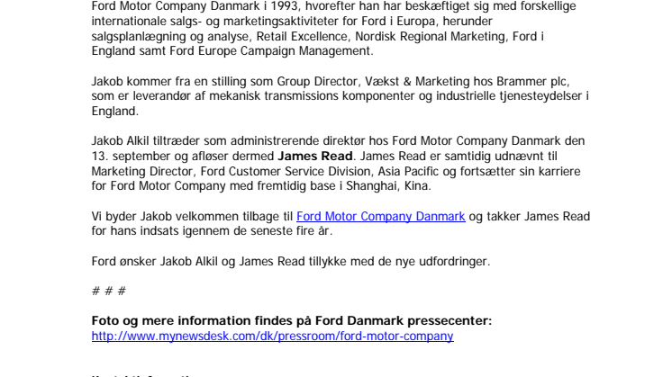 Jakob Alkil tiltræder som administrerende direktør hos Ford Motor Company Danmark den 13. september og afløser dermed James Read. James Read er samtidig udnævnt til Marketing Director, Ford Customer Service Division, Asia Pacific og fortsætter sin karriere for Ford Motor Company med fremtidig base i Shanghai, Kina.
