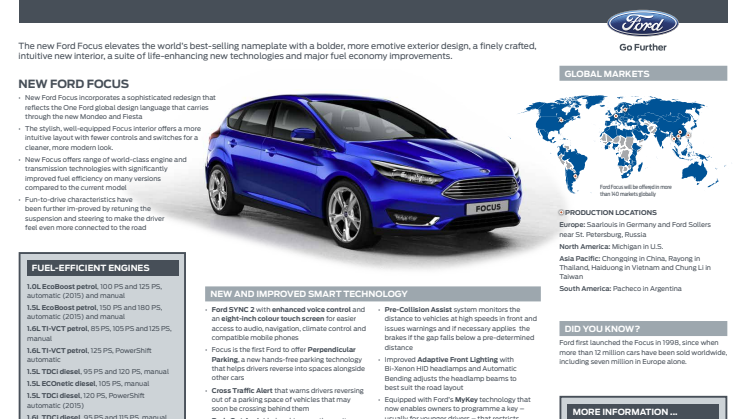 Den nye Focus er også den første europæiske Ford-model med SYNC 2 – anden generation af Fords prisvindende infotainment-system. En nyudviklet otte tommers touch screen i høj opløsning gør det, sammen med systemets stemmestyring, nemt at styre musik, navigation, klimaanlæg og kompatible digitale enheder som for eksempel mobiltelefoner.