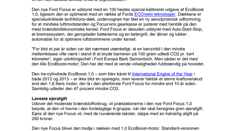 I begyndelsen af 2014 vil Ford introducere en ny, optimeret udgave af Ford Focus med den prisvindende 1,0 EcoBoost benzin-motor. Den nye Ford Focus 1,0 bliver den første benzindrevne familiebil i Europa, der udleder mindre end 100 gram CO2 pr. kørt kilometer. Det svarer til mere end 23 kørte kilometer på literen, og dermed kan ’Familien Danmark’ få en bil i den absolut laveste ende af afgiftsskalaen.