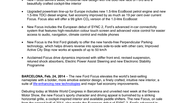 - Vi har udviklet den nye Focus til at slå benene væk under alle – og det uanset om vi taler teknologi, design, brændstoføkonomi eller den køreoplevelse, som Focus allerede er berømt for, sagde chefen for Ford Europa, Stephen Odell, da den nye Ford Focus blev afsløret på Mobile World Congress i Barcelona i dag.