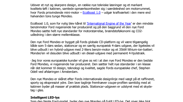 -Jeg tror vores europæiske kunder vil give os ret i at den nye Ford Mondeo er den bedste Ford Mondeo, vi nogensinde har produceret. Den sætter helt nye standarder i sin klasse når det kommer til design, teknologi og kvalitet, sagde Fords europæiske chef, Stephen Odell ved afsløringen i Amsterdam.