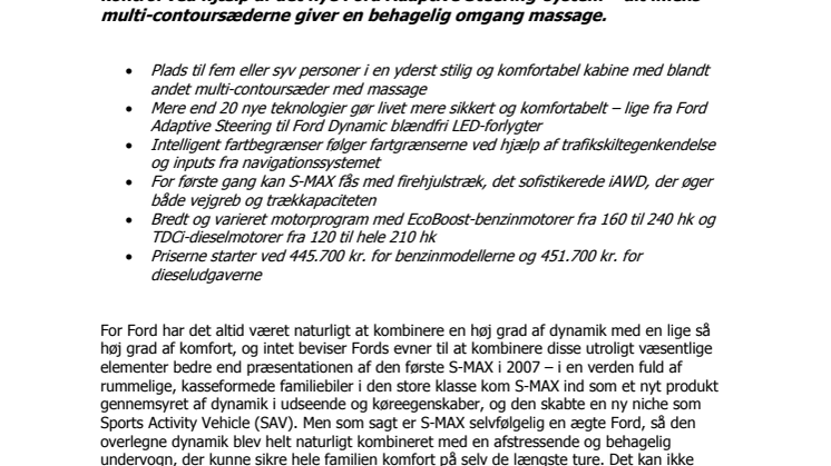 Sofistikeret og behagelig, sikker og intelligent, sportslig og komfortabel. Den nye generation af Fords succesfulde S-MAX træder ind på scenen for Sports Activity Vehicles (SAV) fyldt med nye teknologier, som gør livet mere komfortabelt og sikkert for hele familien. Den intelligente fartbegrænser følger selv hastighedsgrænserne, mens føreren har fuld kontrol ved hjælp af det nye Ford Adaptive Steering-system – alt imens multi-contoursæderne giver en behagelig omgang massage.