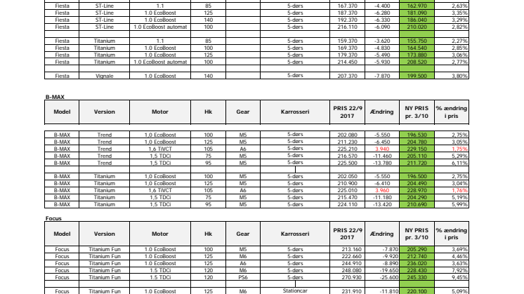 På Fords mindste model Ford Fiesta betyder afgiftsændringen et prisfald på op til 7.870 kroner (Fiesta Vignale). En Ford Fiesta ’Bestseller’, Titanium 1.0 med 100 hk vil, efter afgiftsændringen træder i kraft, koste 164.540 kroner.