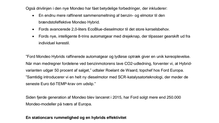 ”Ford Mondeo Hybrids raffinerede automatgear og lydløse optræk giver en unik køreoplevelse. Når man medregner fordelene ved benzinmotorens lave CO2-udledning, forventer vi, at Hybrid-varianten udgør 50 procent af salget,” udtaler Roelant de Waard, topchef hos Ford Europa. ”Samtidig introducerer vi en helt ny dieselmotor med SCR-katalysatorteknologi, der møder de seneste Euro 6d-TEMP-krav om udslip.”