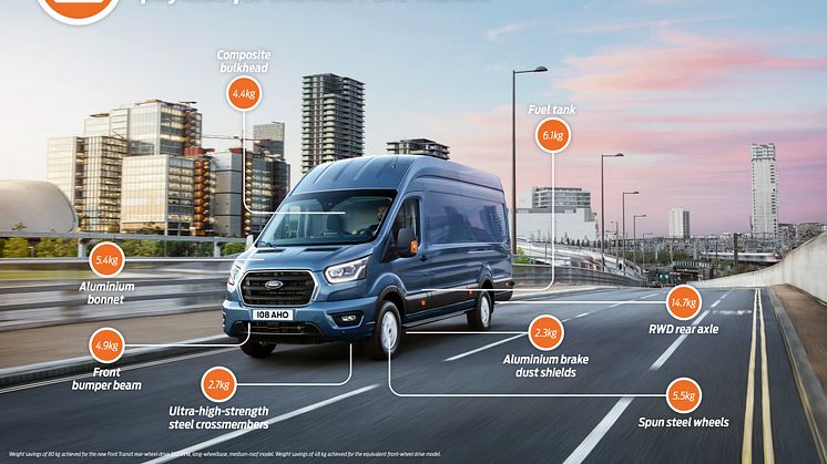 En ekstra vægtreducering på 14,7 kg i den nye baghjulstrukne Transit er opnået med en ombygning af bagakslen, mens varerumsadskillelse i letvægtskomposit sparer 4,4 kg sammenlignet med en tilsvarende varerumsadskillelse af stål.
