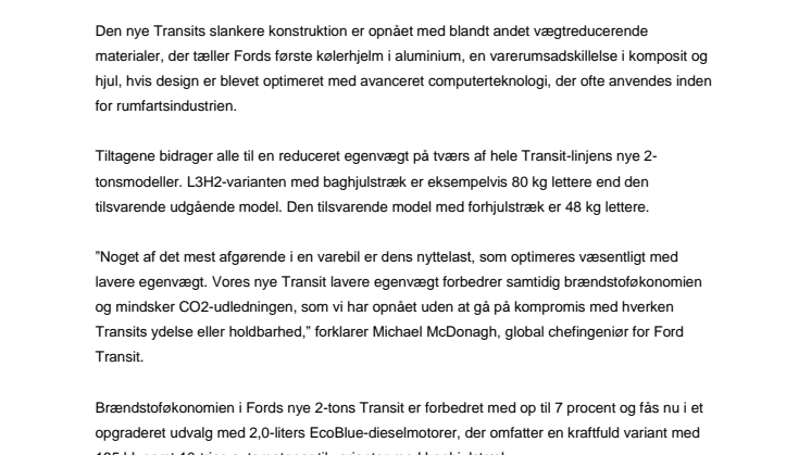 ”Noget af det mest afgørende i en varebil er dens nyttelast, som optimeres væsentligt med lavere egenvægt. Vores nye Transit lavere egenvægt forbedrer samtidig brændstoføkonomien og mindsker CO2-udledningen, som vi har opnået uden at gå på kompromis med hverken Transits ydelse eller holdbarhed,” forklarer Michael McDonagh, global chefingeniør for Ford Transit.