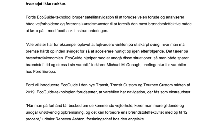 De fleste bilister ved, at man kører længere på literen, hvis bare man er påpasselig med gaspedalen. Ford introducerer nu for første gang varebilsteknologien EcoGuide, der hjælper med at spare på brændstoffet ved at forudse vejen forude – selv fra distancer, hvor øjet ikke rækker.