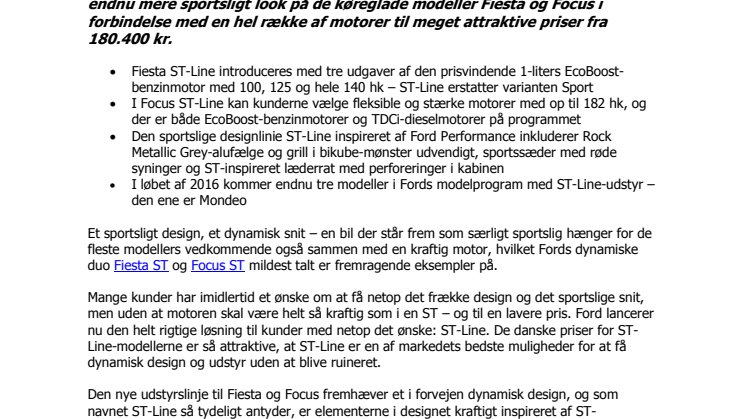 Med tydelige træk fra Fords sprudlende sportsmodeller Fiesta ST og Focus ST lanceres de mere jordnære udgaver af Fiesta og Focus nu med et dynamisk design fra Ford Performance. ST-Line er en ny måde for Fords kunder at få et endnu mere sportsligt look på de køreglade modeller Fiesta og Focus i forbindelse med en hel række af motorer til meget attraktive priser fra 180.400 kr.