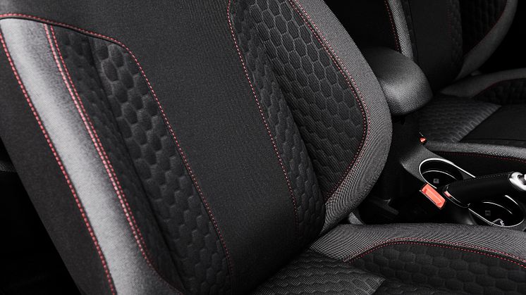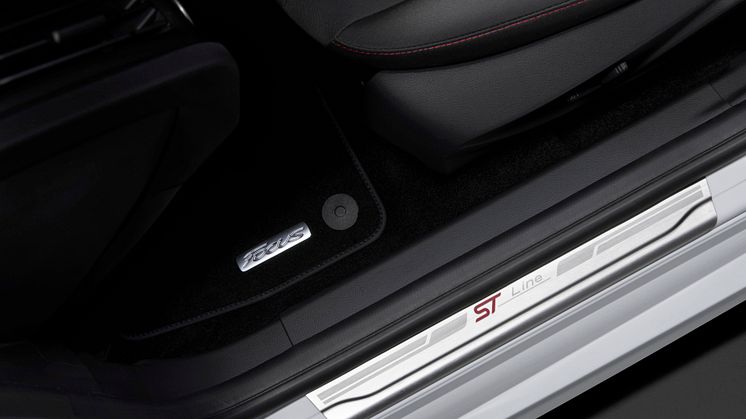 Når man åbner døren i en af de nye ST-Line-modeller, møder man øjeblikkeligt ændringer, der står i sportens tegn. For det første er der de velstøttende sportssæder med røde syninger og et sportslæderrat i ST-stil med perforeret læder og grå syninger. Kigger man lidt nærmere, vil man opdage sort stof på indersiden af taget og stolperne, en gearknop i ST-stil og indstigningslister med ST-Line-logo. I Fiesta ST-Line er der desuden tilføjet aircondition og SYNC 1.1 med Bluetooth og automatisk nødopkald.