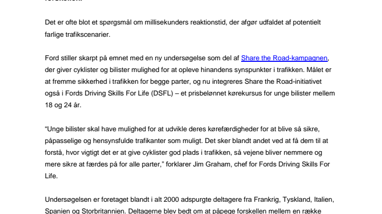 Ford stiller skarpt på emnet med en ny undersøgelse som del af Share the Road-kampagnen, der giver cyklister og bilister mulighed for at opleve hinandens synspunkter i trafikken. Målet er at fremme sikkerhed i trafikken for begge parter, og nu integreres Share the Road-initiativet også i Fords Driving Skills For Life (DSFL) – et prisbelønnet kørekursus for unge bilister mellem 18 og 24 år.