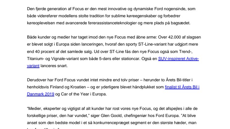 Både kunder og medier har taget imod den nye Focus med åbne arme: Over 42.000 af slagsen er blevet solgt i Europa siden lanceringen, hvoraf den sporty ST-Line-variant har udgjort mere end 40 procent af det samlede salg. Ud over ST-Line fås den nye Focus også som Trend-, Titanium- og Vignale-variant som både 5-dørs eller stationcar. Også en SUV-inspireret Active-variant lanceres snart.