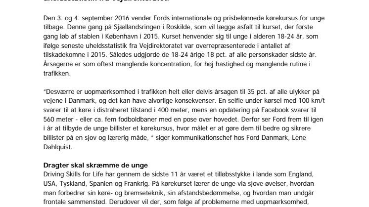 Den 3. og 4. september 2016 vender Fords internationale og prisbelønnede kørekursus for unge tilbage. Denne gang på Sjællandsringen i Roskilde, som vil lægge asfalt til kurset, der første gang løb af stablen i København i 2015. Kurset henvender sig til unge i alderen 18-24 år, som ifølge seneste uheldsstatistik fra Vejdirektoratet var overrepræsenterede i antallet af tilskadekomne i 2015. Således udgjorde de 18-24 årige 18 pct. af alle personskader sidste år. Årsagerne er som oftest manglende koncentration, for høj hastighed og manglende rutine i trafikken.