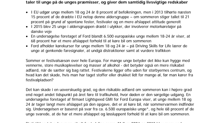 Med varmen, solen og de lange sommeraftener kommer vovemodet og de dårlige vaner. Unge mellem 18 og 24 år påvirkes i høj grad af sommeren, og det fører til en stærk stigning i antallet af alvorlige trafikuheld for aldersgruppen på den årstid. Ford ønsker med sit gratis kørekursus rettet netop mod de unge at hjælpe med til, at både antallet af uheld og adfærden ændres – kørekurset Driving Skills for Life taler til unge på de unges præmisser, og giver dem samtidig livsvigtige redskaber