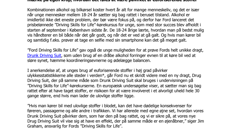 Fords engagement i kampen mod usikker og uforsvarlig kørsel er i konstant udvikling, og kørekurset ”Driving Skills for Life” for unge mellem 18-24 år er tilbage i Danmark i 2016. I den anledning er Ford klar med en særlig dragt, der lader unge mærke på egen krop, hvordan det føles at være påvirket af euforiserende stoffer.