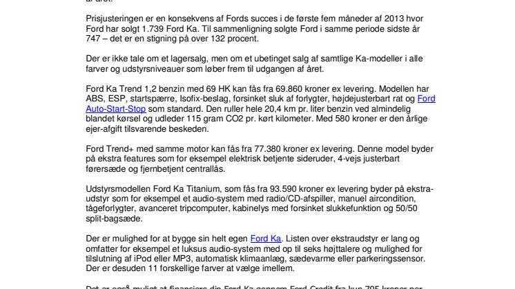 Prisjusteringen er en konsekvens af Fords succes i de første fem måneder af 2013 hvor Ford har solgt 1.739 Ford Ka. Til sammenligning solgte Ford i samme periode sidste år 747 – det er en stigning på over 132 procent.